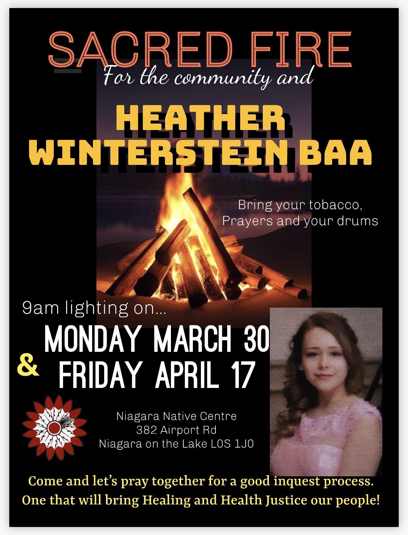 Read Day One SummaryThe Sacred Fire will be lit again on Friday, April 17 at 9:00 a.m. at the Niagara Regional Native Centre. Community members are welcome to attend, bring tobacco and prayers, and continue supporting the family and healing for all.